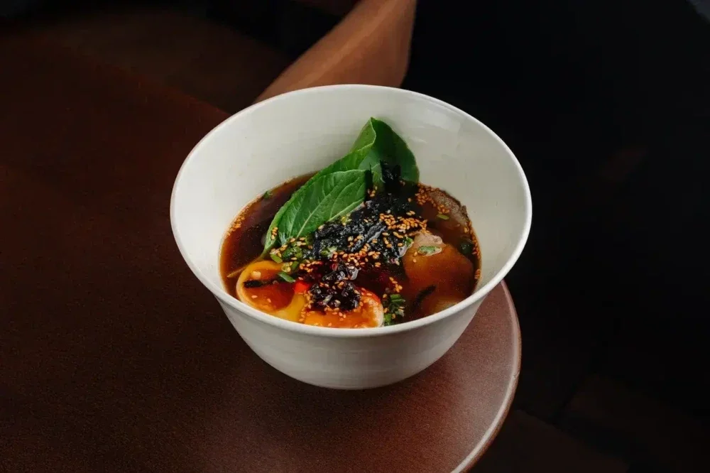 Бульон из говядины, лапша, говядина глазной мускул су-вид, маринованное яйцо, бок-чой, зелёный лук, кунжут кимчи, нори, соевые бобы