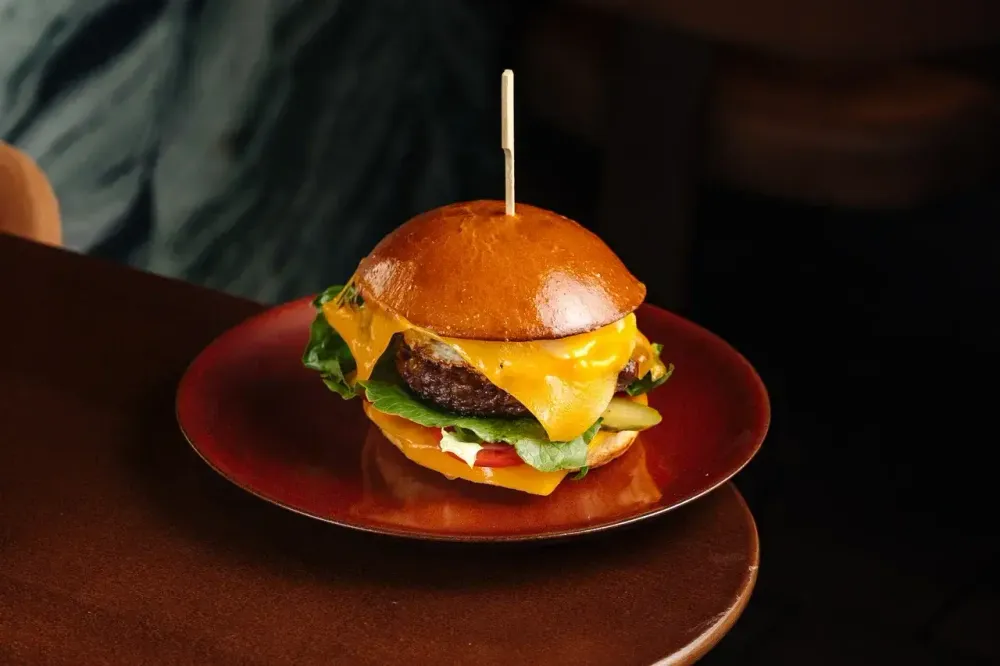 Говяжий фарш для бургера, булочка для гамбургеров, масло сливочное топлёное, сыр чеддер, огурцы маринованные, салат ромейн, маринованный лук в шисо, спайси соус, соус азиатский, томаты премиум свежие.глазунья