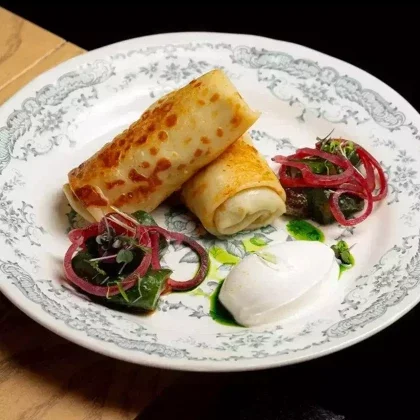 Блины с говядиной,трюфелем и битым огурцом