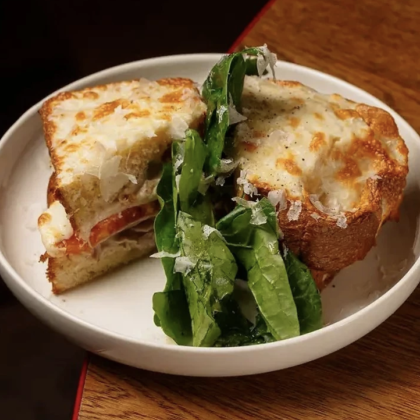 Бриошь с ветчиной, моцареллой, томатами и соусом "Тоннато"