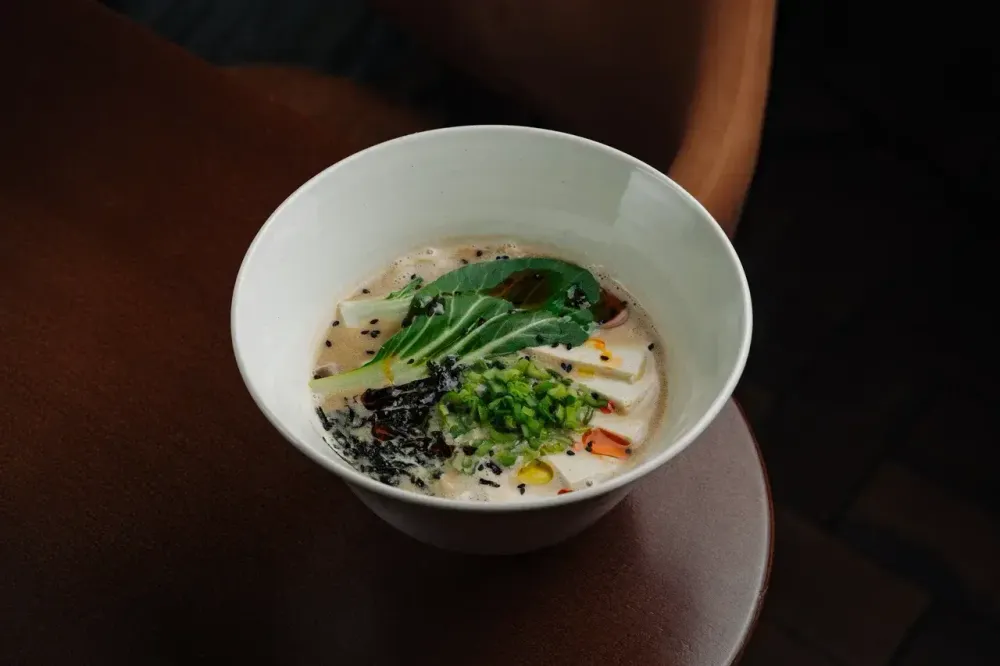 Рамен с тофу и грибами — согревающий бульон на основе грибов и кокосового молока с добавлением чили-масла. В составе — лапша рамен, нежный соевый тофу, вешенки, водоросли вакаме и жареные нори. Завершает блюдо аромат чесночного масла и пикантная приправа с кунжутом кимчи.