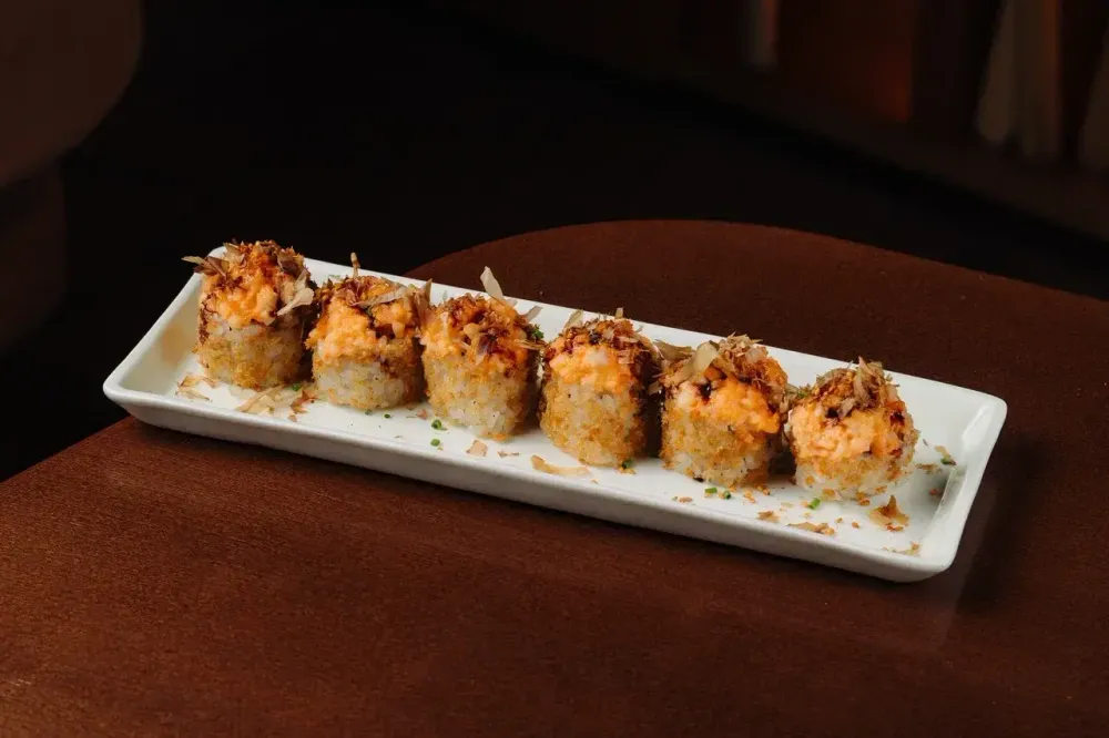 Запеченный ролл с нежным лососем, креветкой и сливочным сыром под пикантным соусом