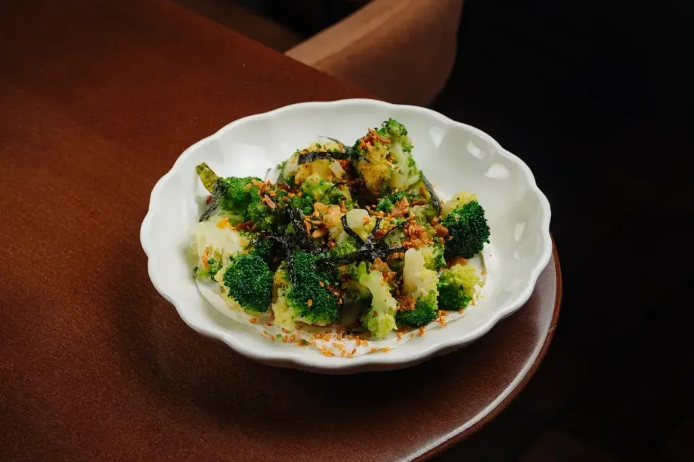 Нежные брокколи с йогуртом лабне и пряным соусом, посыпанная хрустящим луком