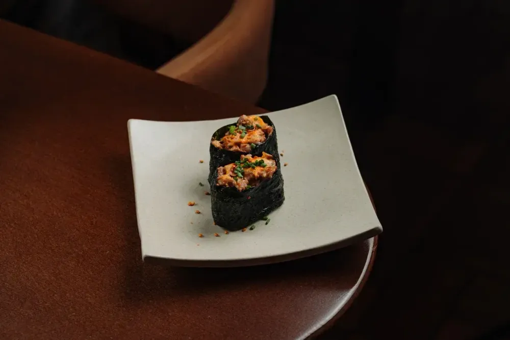 Копченый угорь под пикантным спайси-соусом с икрой тобико