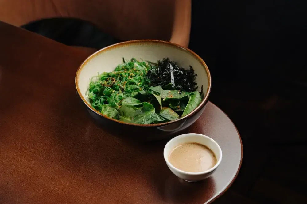 Нежные листья чуки и хрустящий шпинат под ароматным ореховым соусом