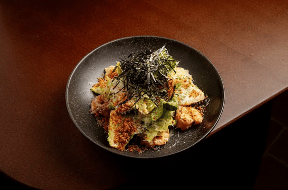 Салат ромен, соус цезарь, креветки очищенные, масло сливочное кимчи, соус соевый, сыр тёртый пармезан, чипсы из нори, кранч сухари.