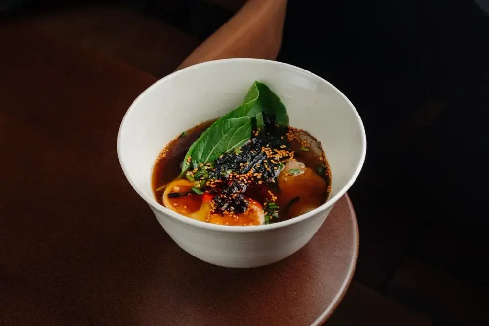 Бульон из говядины, лапша, говяжий глазной мускул, маринованное яйцо, бок-чой, зелёный лук, кунжут кимчи, нори, соевые бобы