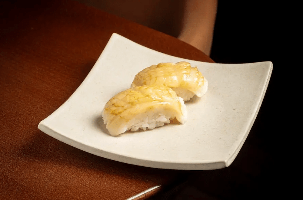 Гребешок, рис, васаби, даши терияки (мирин, соевый соус, вода, саке, сахар, комбу (водоросль), стружка тунца). Подаётся по 2 штуки.