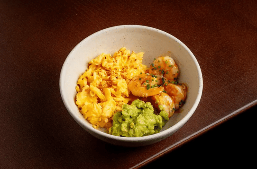 Микс для омлета (яйцо куриное, сливки 22%), масло сливочное топленое, креветки очищенные, масло сливочное кимчи, соус соевый, мятое авокадо, кунжут, лук-сибулет.