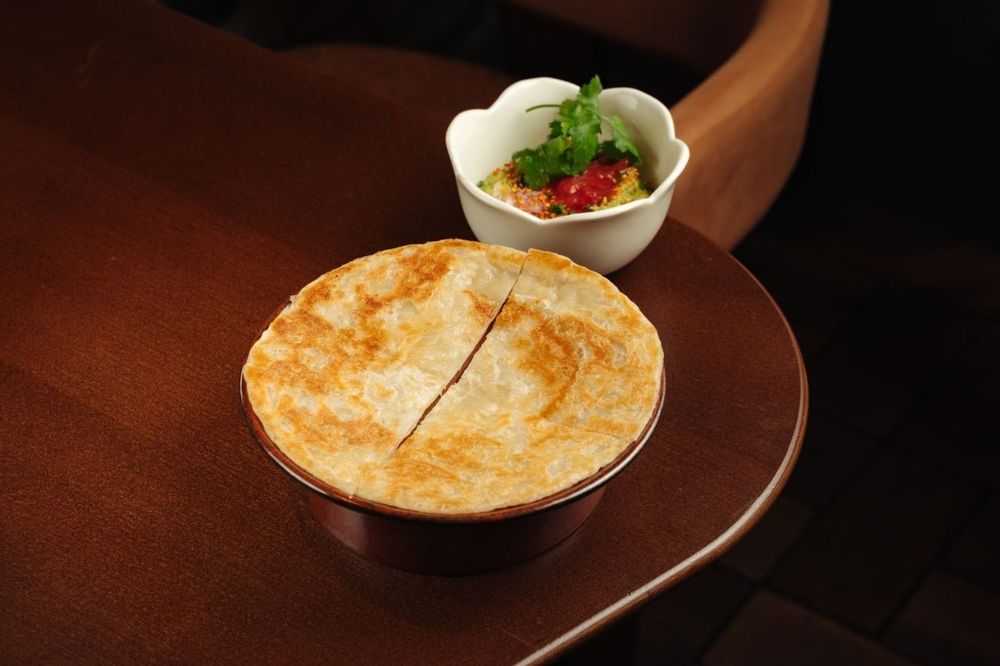 Лепешка роти, мятое авокадо, томатная сальса, маринованный лук в шисо, лук-сибулет, масло оливковое чесночное, шичими, приправа кунжут.
