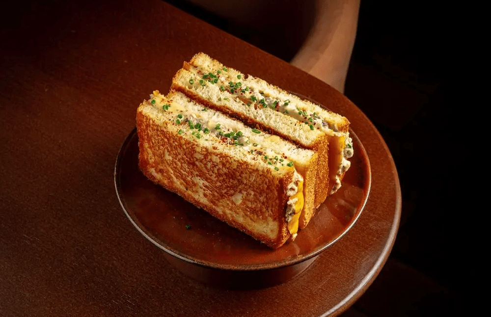 Хлеб, масло сливочное топленое, тунец на сэндвич (тунец консервированный, майонез японский, каперсы консервированные, зелень петрушки, огурцы маринованные, масло из чили), сыр чеддер, соус сладкая горчица, майонез японский, горчица, мёд, соус соевый, лук-сибулет.