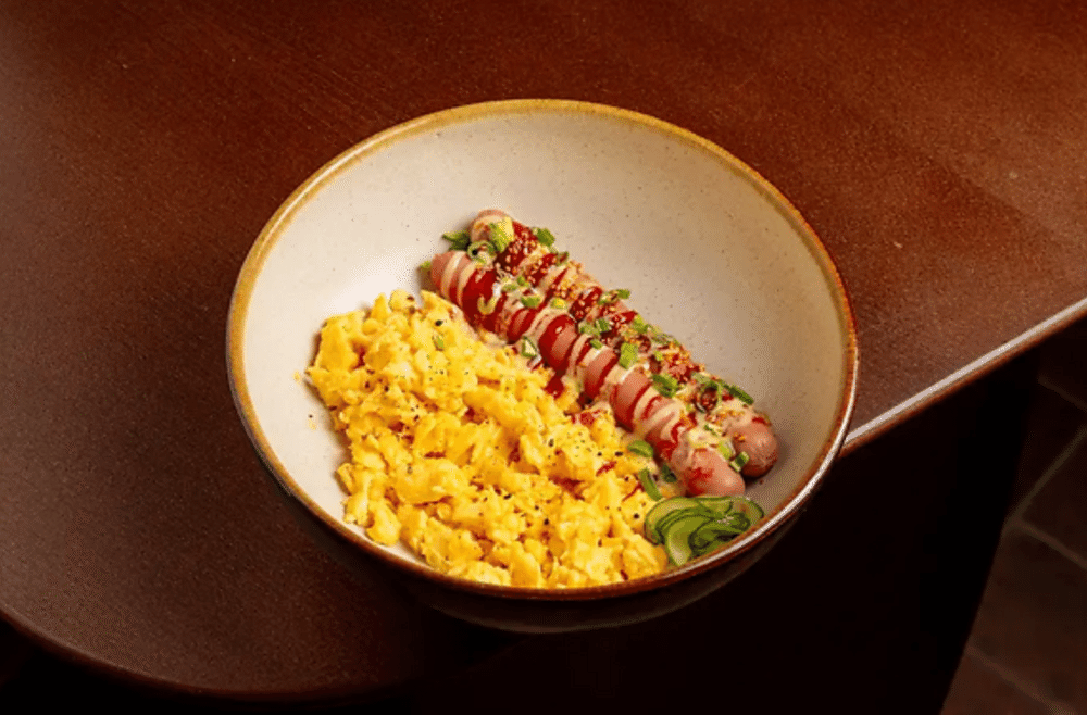 Микс для омлета (яйцо куриное, сливки 22%), сосиски, масло оливковое чесночное, сладкая горчица, маринованные огурцы, лук зелёный свежий, кунжут.