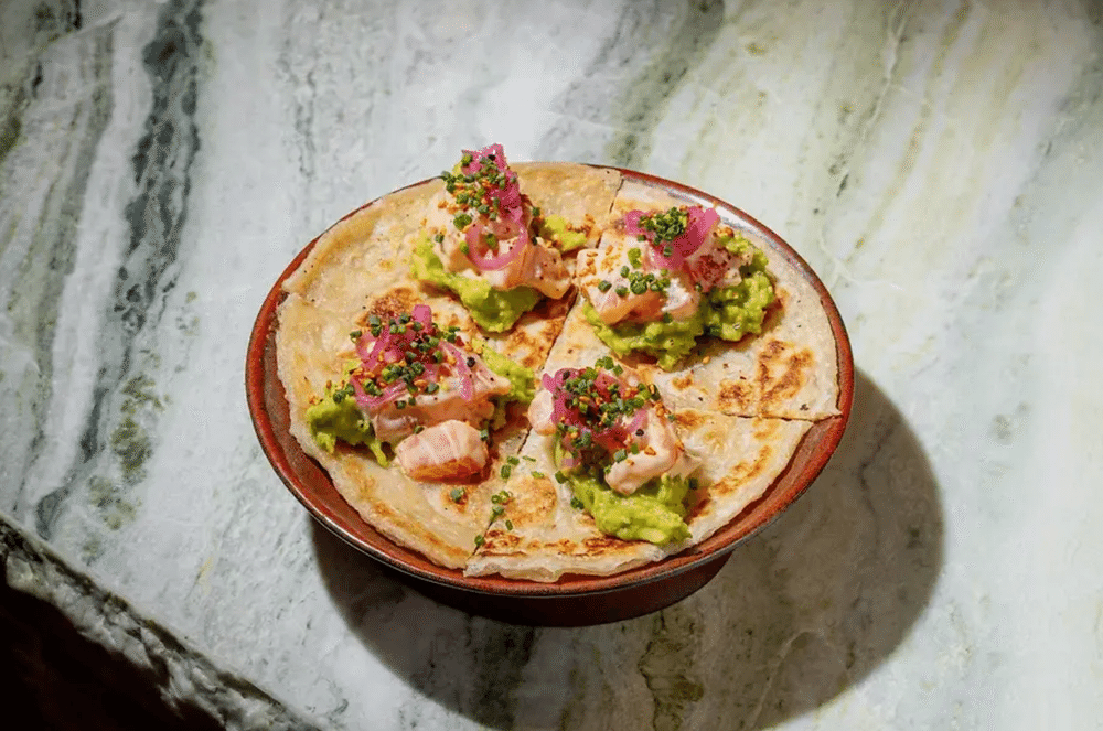 Лепешка роти, мятое авокадо, филе лосося, спайси-соус, шичими, маринованный лук в шисо, лук-сибулет, соус даши-терияки, кунжут.