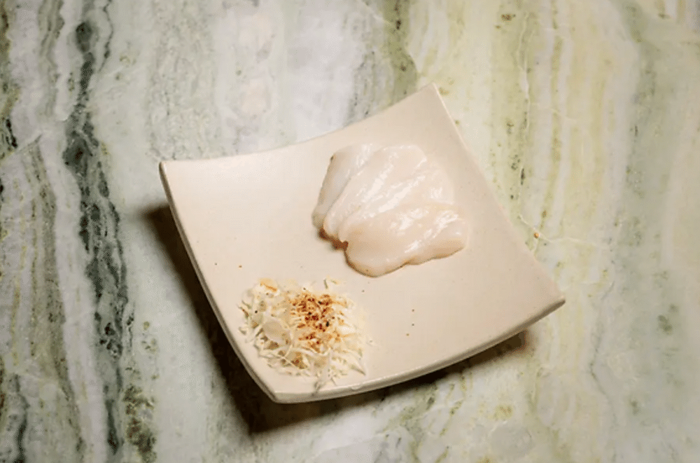 Гребешок свежий, капуста белокочанная свежая, соус кунжутный дрессинг, лук сибулет, соус понзу, специя шичими.