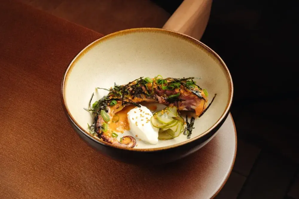 Осьминог, эмульсия сальса, лук зеленый свежий, водоросли нори, маринованные огурцы, специи, приправа кунжут с кимчи, йогурт греческий, масло растительное.