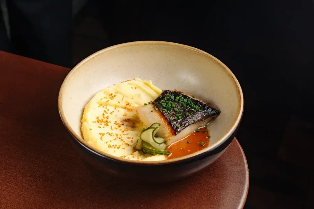 Палтус с васаби-пюре и спайси понзу