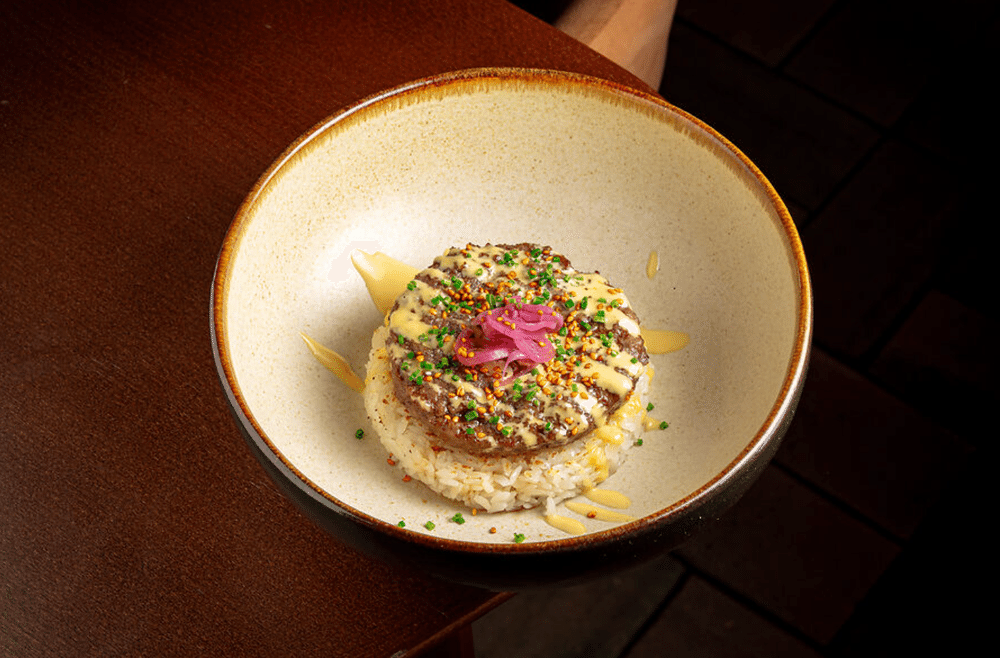 Фарш для бургера, рис, масло сливочное топлёное, соус сладкая горчица, маринованный лук в шисо, соус соевый, лук-сибулет, специи, приправа кунжут с кимчи.