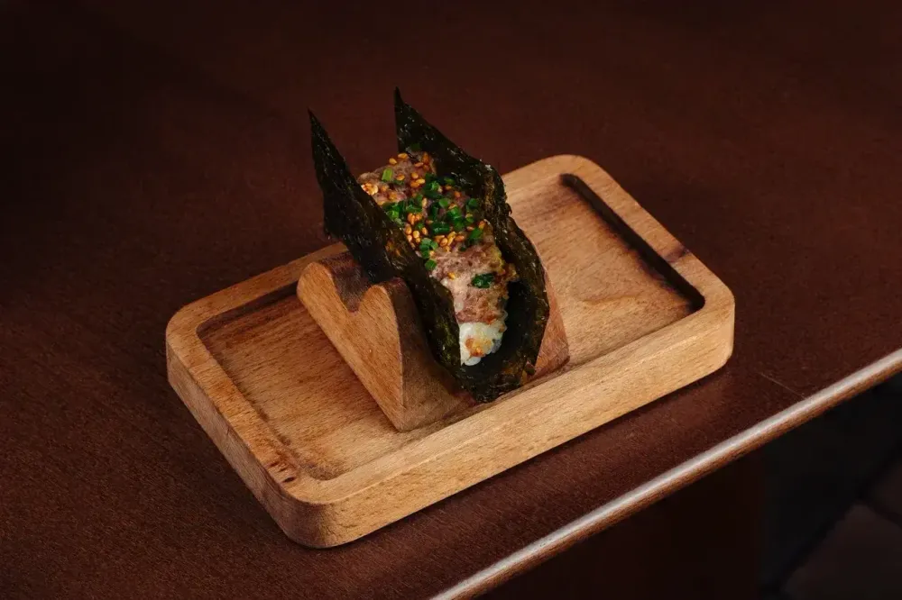 Говяжий кострец, лук-шнитт, cпайси-соус (японский майонез, паста табаджан, масло кунжутное, мирин)