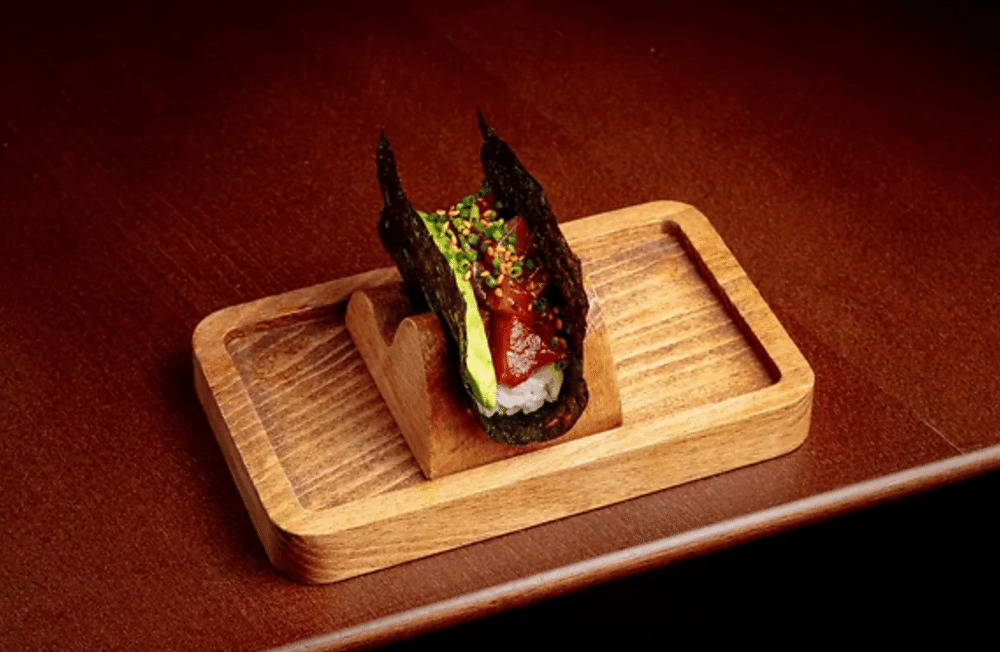 Чипсы из нори, жареный нори, рис для суши, тунец блюфин, авокадо хасс, лук-сибулет, соус даши-терияки, масло оливковое чесночное, васаби-порошок, специи приправа кунжут с кимчи.
