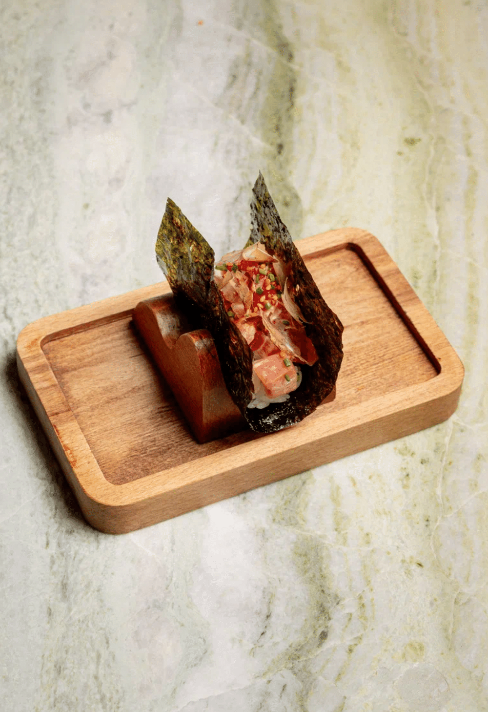 Чипсы из нори, жареный нори, рис для суши, тунец Еллоуфин филе, спайси-соус, лук-сибулет, специи, приправа кунжут с кимчи, соус даши-терияки, стружка тунца бонито, икра тобика.