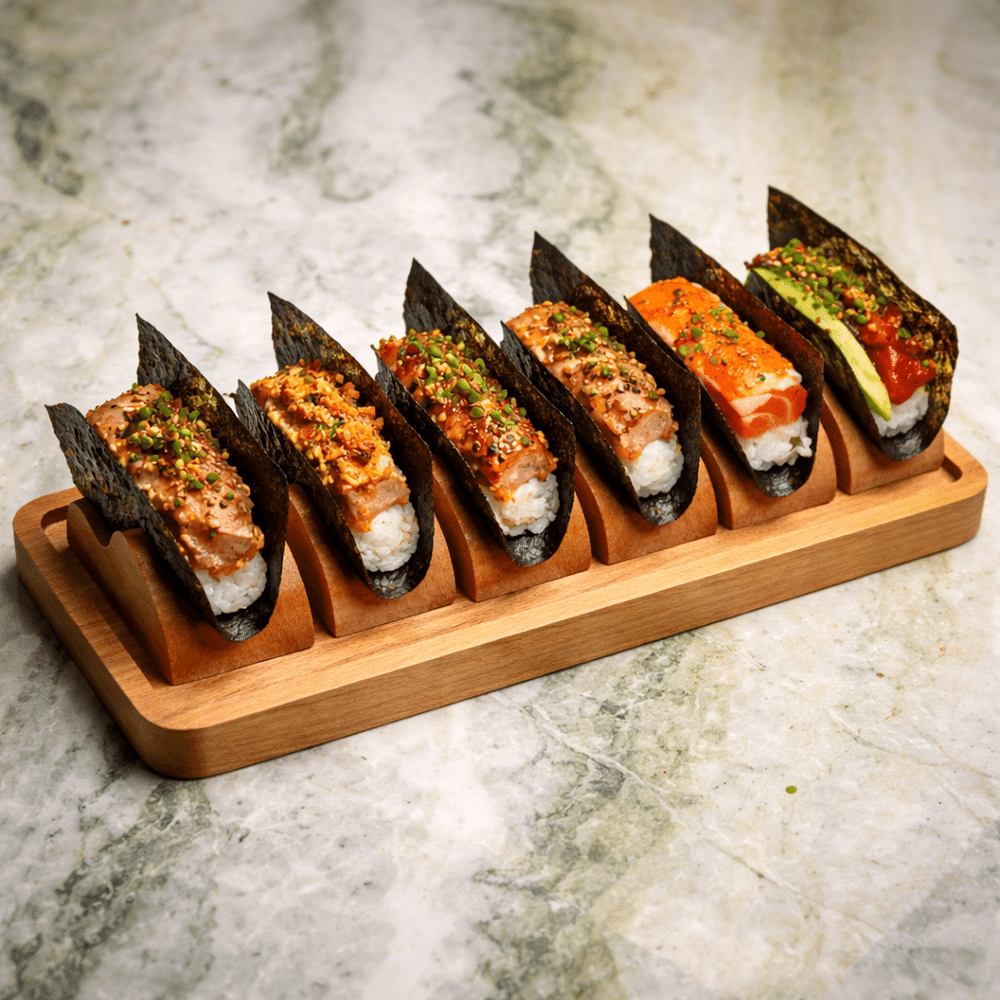 Состав сета: Лосось спайси, гребешок перуанский терияки, краб спайси, тунец блюфин, обожженный лосось, угорь огурец (6 шт.)