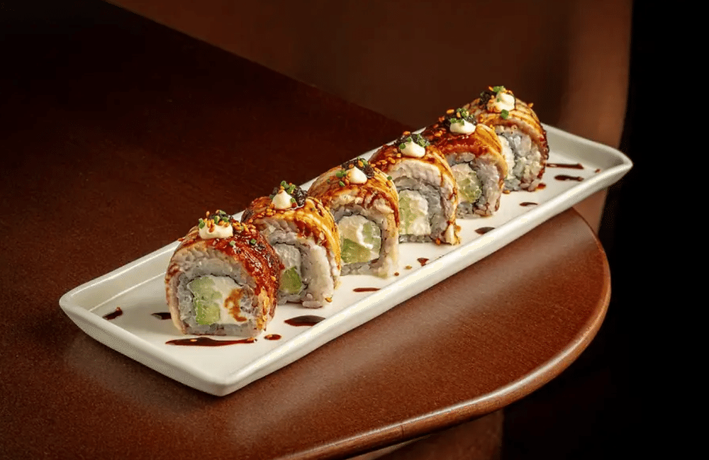 Рис для суши, водоросли нори, огурцы, угорь копчёный, авокадо хасс, сыр сливочный-творожный, майонез японский, паста трюфельная, соус унаги, лук-сибулет, специи, приправа кунжут с кимчи, васаби-порошок, имбирь маринованный.