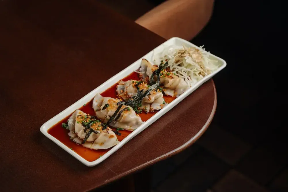 Тесто, фарш куриный, капуста белокочанная свежая, соус понзу, кунжут, соус кунжутный дрессинг, лук-сибулет, водоросли нори.