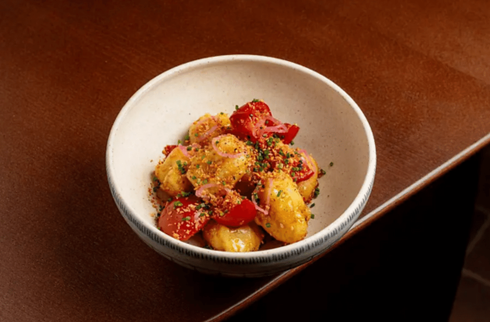 Баклажаны свежие, соус глейз на баклажаны, томаты свежие, маринованный лук в шисо, лук шнитт, специи приправа кунжут с кимчи, специя шичими, кранч сухари.