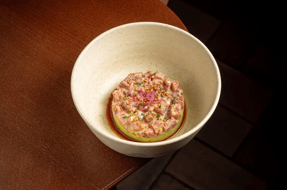 Мятый авокадо, филе тунца, спайси-соус, соус даши терияки, маринованный лук в шисо, специи, приправа кунжут с кимчи, лук-сибулет, соус понзу.