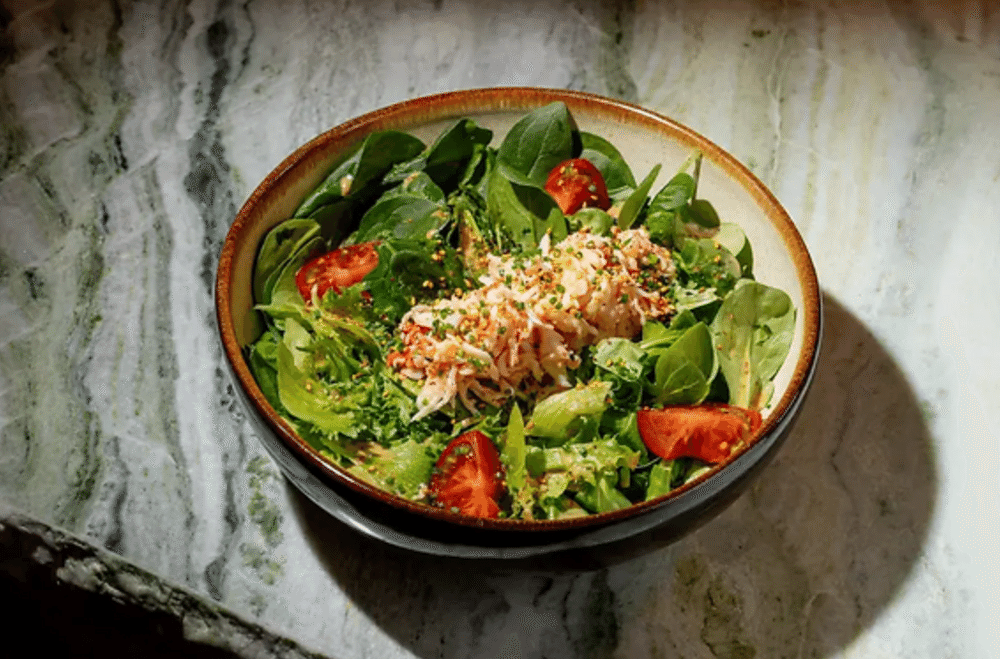 Томаты свежие, шпинат мини, салат маше, авокадо хасс очищенный, краб роза, салат фриссе, соус кунжутный дрессинг, масло сливочное чесночное, специи приправа кунжутная, специя шичими, масло оливковое чесночное, лук сибулет.