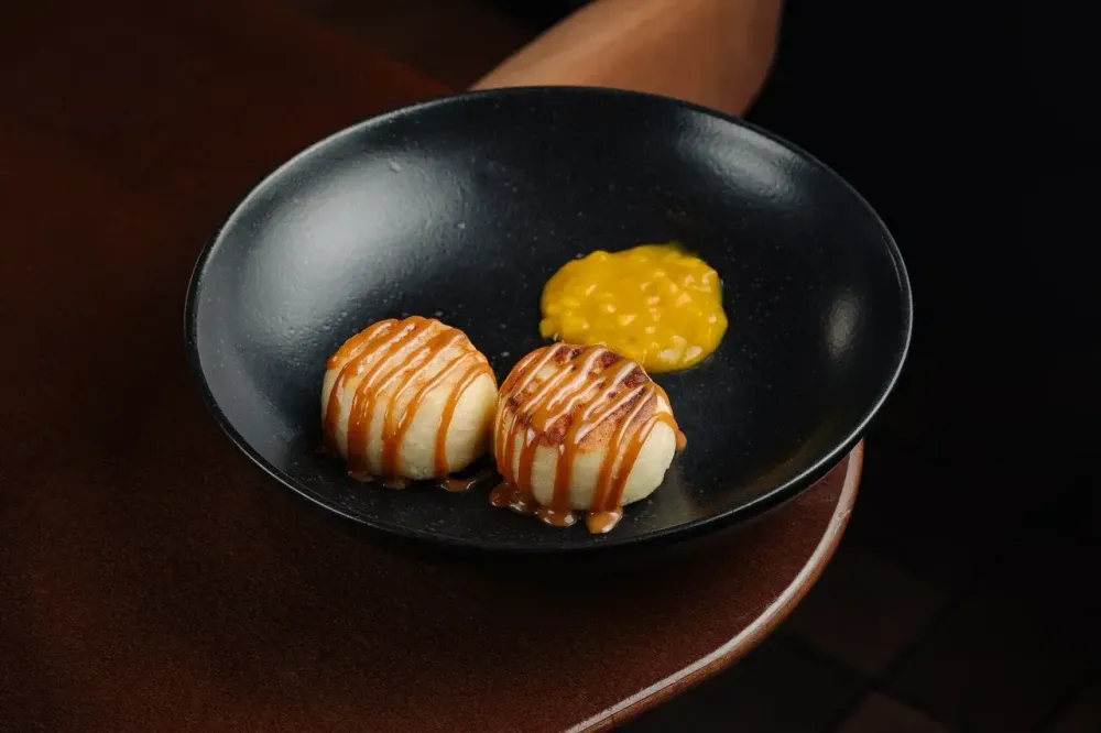 Сырники, ганаш из белого шоколада , манго