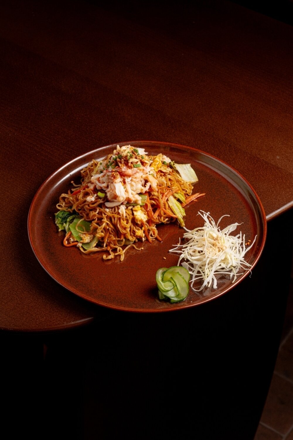 Лапша, капуста белокочанная свежая, маринованные огурцы, краб роза, соус кунжутный дрессинг, специи приправа кунжут с кимчи, соус на роти, масло сливочное топленое, масло растительное.