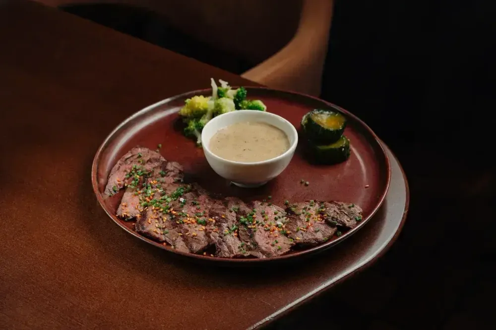 Скерт стейк, соус таре,шафран, запечённый батат, битые огурцы, масло растительное, соус перечный.