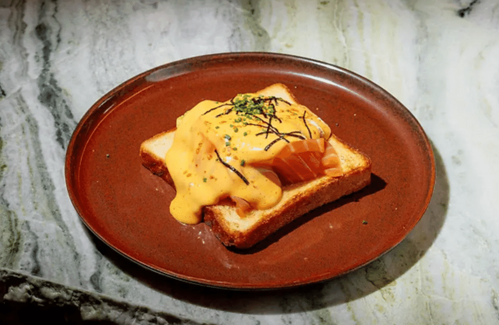 Подрумяненный тост на топлёном сливочном масле, яйцо пашот, мятое авокадо, лосось слабой соли, соус голландез, сибулет, стружка нори и кунжут кимчи.