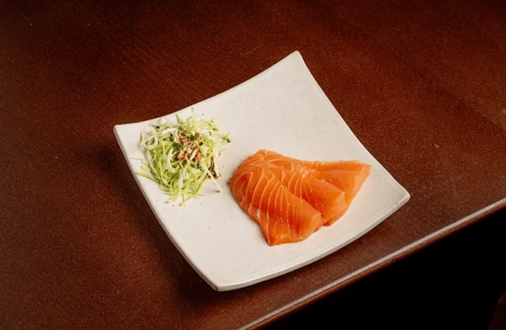 Филе лосося, капуста белокочанная свежая, соус кунжутный дрессинг, лук сибулет, соус понзу, специя шичими.