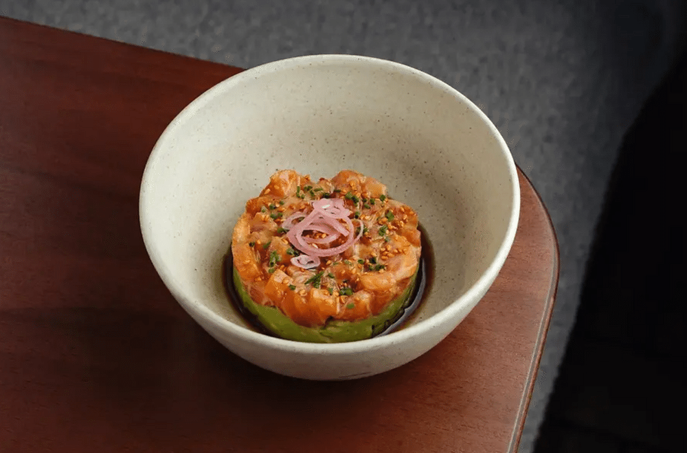 Мятый авокадо, филе тунца, спайси соус, соус даши терияки, маринованный лук в шисо, специи приправа кунжут с кимчи, лук сибулет, соус понзу.