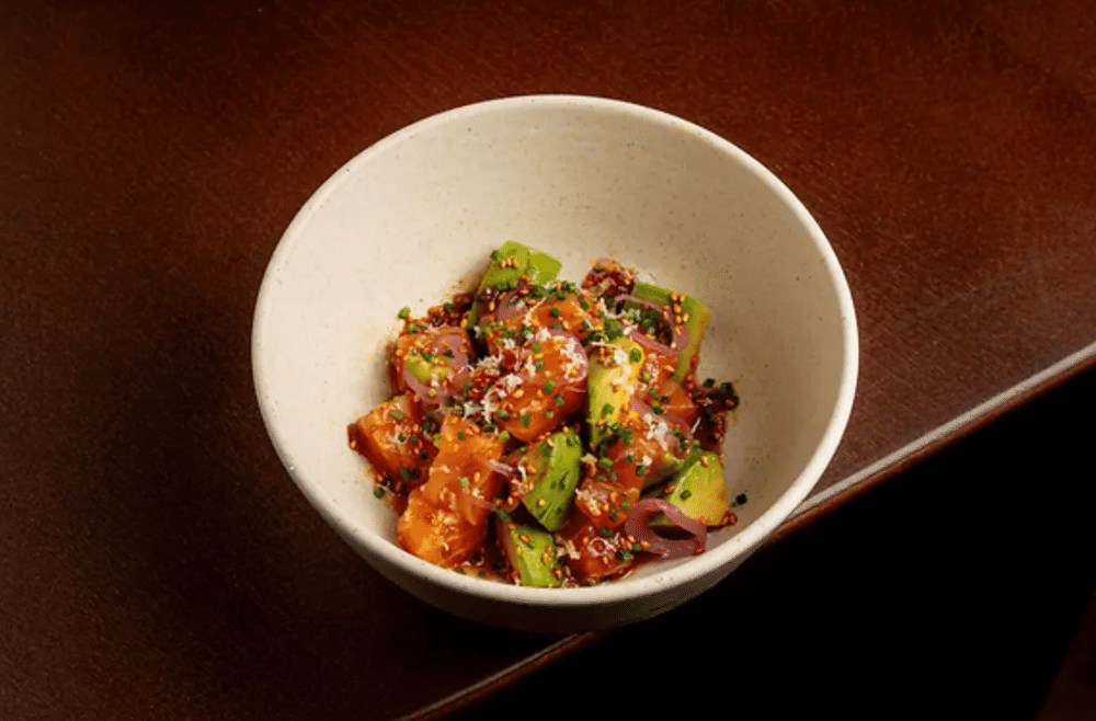 Филе лосося, соус понзу терияки, авокадо хасс, масло оливковое чесночное, лук сибулет, маринованный лук, специи приправа кунжутная, хрен свежий очищенный.